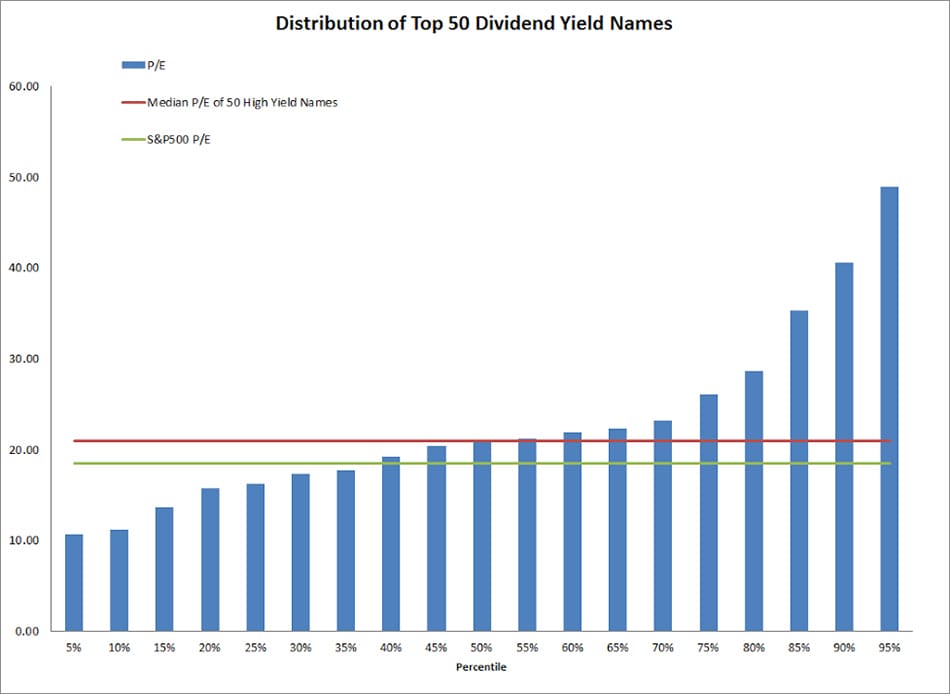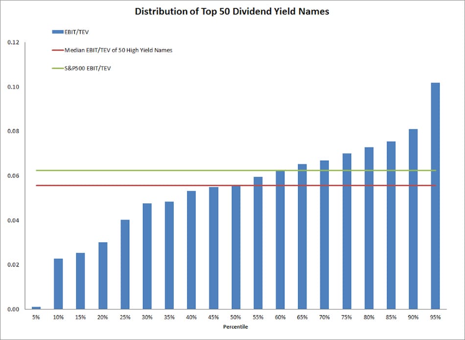 In summary, the top 50 high dividend yield names are expensive relative to the market on EBIT/TEV or P/E metrics. That’s not good.