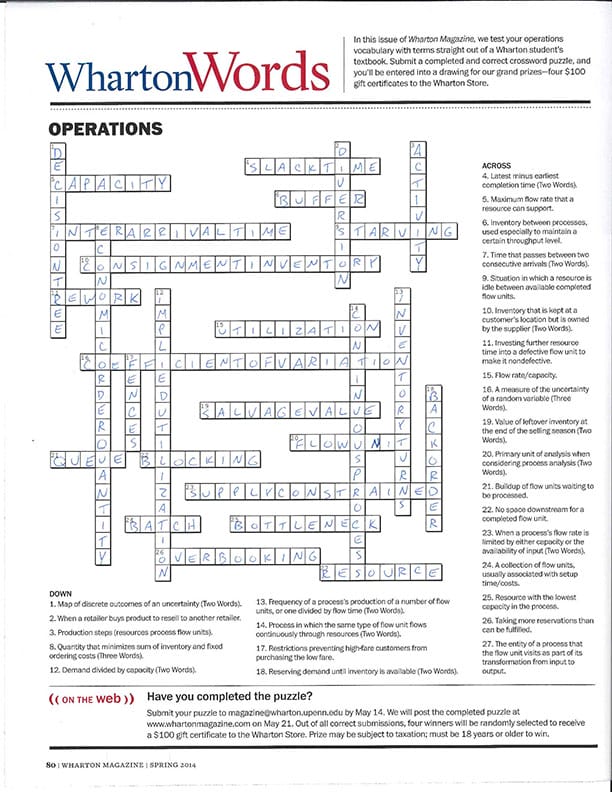 In the Spring 2014 print edition of Wharton Magazine, we tested your operations vocabulary with terms straight out of a Wharton student’s textbook. Here are the answers to the crossword puzzle. (Click on the image below for a larger version.)